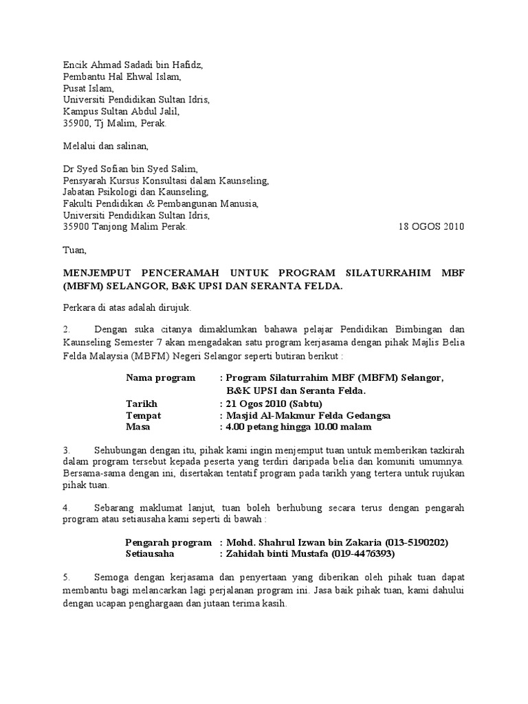 Related : Contoh Surat Jemputan Program / Contoh surat iringan (permohonan kelulusan program)..