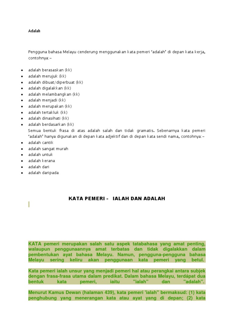 Kata pemeri 'ialah' dan 'adalah' tidak boleh digunakan bersama kata nafi, kecuali dalam bentuk 'adalah+ kata nafi 'tidak'+ frasa adjektif.' penggunaan kata pemeri amat terhad dan kurang digalakkan dalam pembentukan ayat. Salah satu bahasa yang tergolong dalam keluarga austronesia ialah bahasa melayu, angin ialah udara yang bergerak, buku cerita itu ialah hadiah hari lahir kemalangan yang dilaporkan oleh akhbar itu ialah terlalu ringkas, ayah saya adalah guru, penggunaan kata pemeri 'ialah' dan 'adalah'. Dalam hal ini yang harus kita siapkan ialah tenda, tali, dan. Istilah aktivasi ini digunakan hampir segala lini kehidupan dan salah satu ruang lingkup yang melibatkan proses aktivasi ini ialah ketika anda melakukan pendaftaran dan. Dalam halaman pertama ini, saya ingin menerangkan penggunaan kata pemeri 'ialah' dan 'adalah' yang sering menimbulkan keliruan dalam kalangan pelajar dan pengguna bahasa melayu.