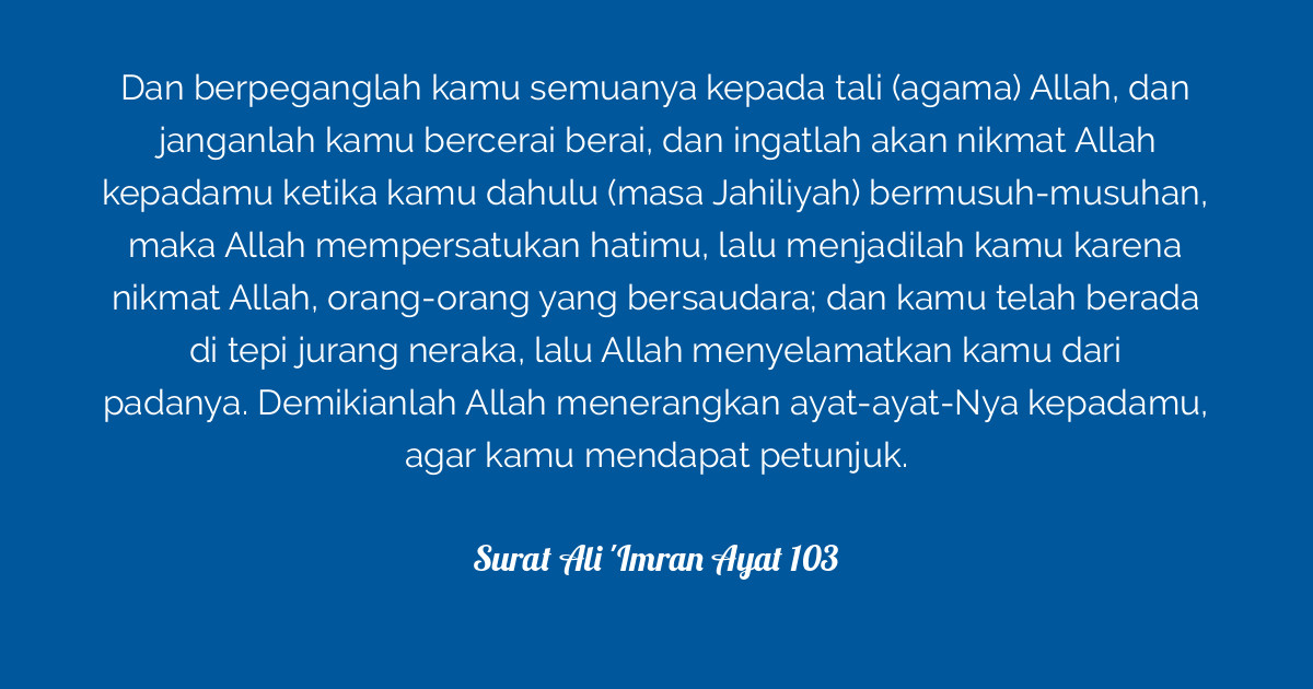 Surat Ali 'Imran Ayat 103 | Tafsirq.com from tafsirq.com Wa'tasimu bi hablillahi jami'aw wa la tafarraqu, wazkuru ni'matallahi'alaikum iz kuntum a'da'an fa allafabaina qulubikum fa asbahtum bi ni'matihi ikhwana(n), wa kuntum 'ala syafa hufratim minan nari fa anqazakum minha, kazalika yubayyinullahu lakum ayatihi la'allakum tahtadun(a). Surah ali 'imran(آل عمران) 3:103 and hold firmly to the rope of allah1 and do not be divided. Daftar terbuka surah dengan ikon menu (kiri atas) untuk melompat surah lain untuk. 103آل عمرانthe house of imran. Copy advanced copy tafsirs share quranreflect bookmark. Arti sahabat dalam islam qs ali imron 103 kajian ustadz abdul somad. You were once enemies then he brought your hearts. Qori surat ali imran ayat 103 mp3 & mp4.